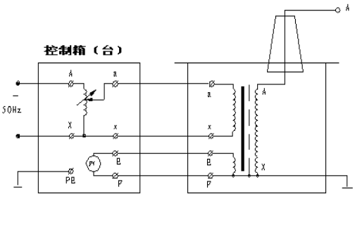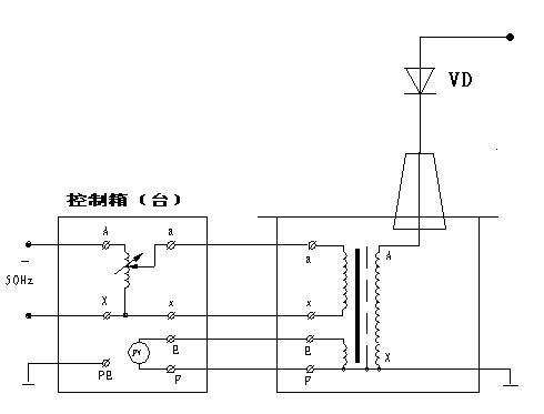 圖3:交流干式試驗(yàn)變壓器接線 2. 交直流干式試驗(yàn)變壓器:如圖4 圖中高壓輸出的上端裝有高壓硅堆,串接在高壓回路中作半波整流,以獲得直流高電壓。當(dāng)取下不接高壓硅堆時,作為直流輸出狀態(tài)。