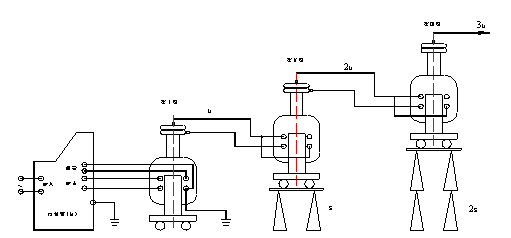 圖4:交直流干式試驗(yàn)變壓器接線 圖中:VD為高壓硅堆 3. 串級干式試驗(yàn)變壓器接線及原理:如圖5 串級干式試驗(yàn)變壓器有很大的優(yōu)越性,三臺試驗(yàn)變壓器串級連接可獲得更高的電壓,因?yàn)檎麄€試驗(yàn)裝置由幾臺單臺試驗(yàn)變壓器組成,單臺試驗(yàn)變壓器容量小、電壓低、重量輕,便于運(yùn)輸和安裝。它既然可串接成高出幾倍的單臺試驗(yàn)變壓器輸出電壓組合使用,又可分開成幾套單臺試驗(yàn)變壓器單獨(dú)使用。整套裝置投資小,經(jīng)濟(jì)實(shí)惠。圖5中,在第一級和第二級的每個單元試驗(yàn)變壓器中都有一個勵磁繞組A1、C1和A2、C2。在串級試驗(yàn)變器基本原理圖中,低壓電源加在試驗(yàn)變壓器I的初級繞組a1x1上,單臺試驗(yàn)變壓Ⅰ、Ⅱ、Ⅲ的輸出電壓都是V。勵磁繞組A1、C1給第二級試驗(yàn)變壓器Ⅱ的初級繞組供電;第二級試驗(yàn)變壓器Ⅱ的勵磁繞組A2、C2給第三級試驗(yàn)變壓器Ⅲ的初級繞組供電。第二級試驗(yàn)變壓器Ⅱ和第三級試驗(yàn)變壓器Ⅲ的箱體分別處在對地為1V和2V的高電位上,所以箱體對地是絕緣的,試驗(yàn)變壓器I的箱體是接地的。這樣第一級、第二級、第三試驗(yàn)變壓器對地的額定輸出電壓分別為1V、2V、3V;其額定容量分別為3P、2P、1P。